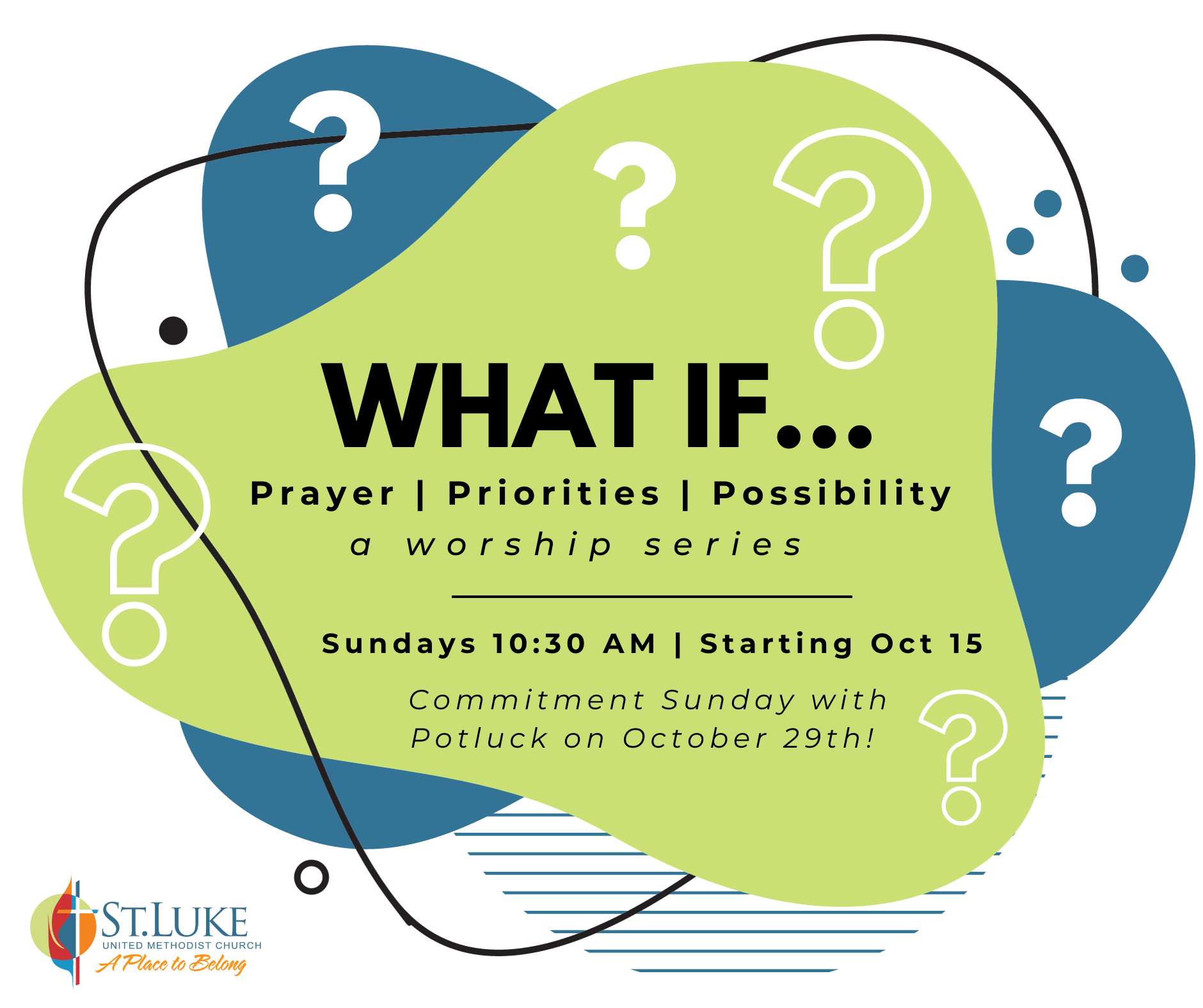 “What if?” That phrase can strike fear in all of our hearts and minds as we consider all the things that could go wrong in our world, especially when it comes to our finances. Security is one of our basic needs, and thinking about all the “what ifs” can cause panic and anxiety when we think about future plans. But what if we trusted God? What if we prayed? What if we put got first? What if we focused less on fear and more on possibility? Join us on Sundays at 10:30 AM starting October 15th as we imagine together what God can do when we trust God with all we’ve been blessed with!